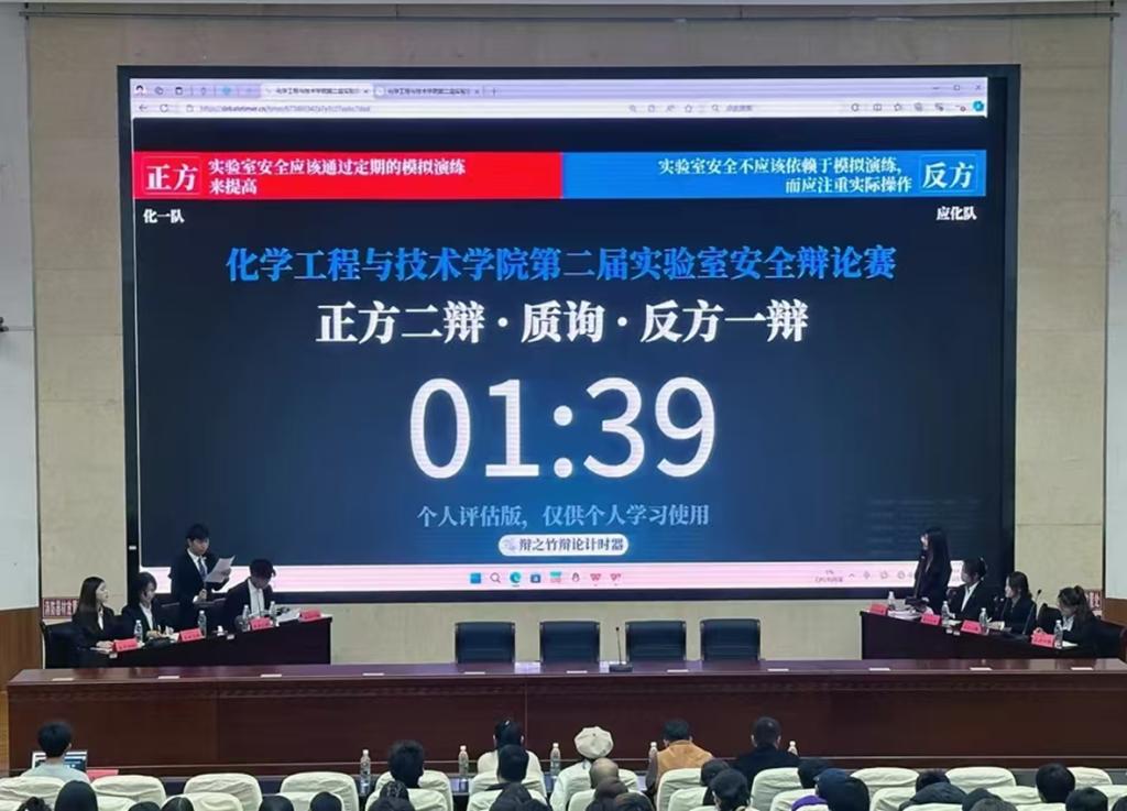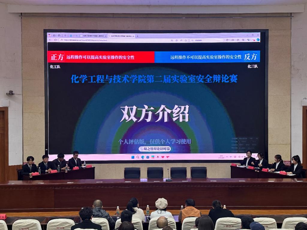 共有化一队、化三队、应化队和化工队四支队伍参加辩论赛半决赛和决赛,比赛分两场进行。第一场是由化一队和应化队以“实验室安全应该通过定期的模拟演练来提高,还是更注重实际操作”为辩题,正方强调定期的模拟演练可以提高实验室安全性的关键,反方则以设备故障的突发性和不可预测性为切入点,阐述了设备实验技能的重要性。第二场是由化三队和化工队以“远程操作能否提高实验室安全性”为主题,正方认为实验室安全以人为本,远程操作避免人员伤亡,反方则力陈远程操作的不切实际。两场辩论赛过程中,双方辩手唇枪舌剑、你来我往,现场气氛热烈,掌声不断。