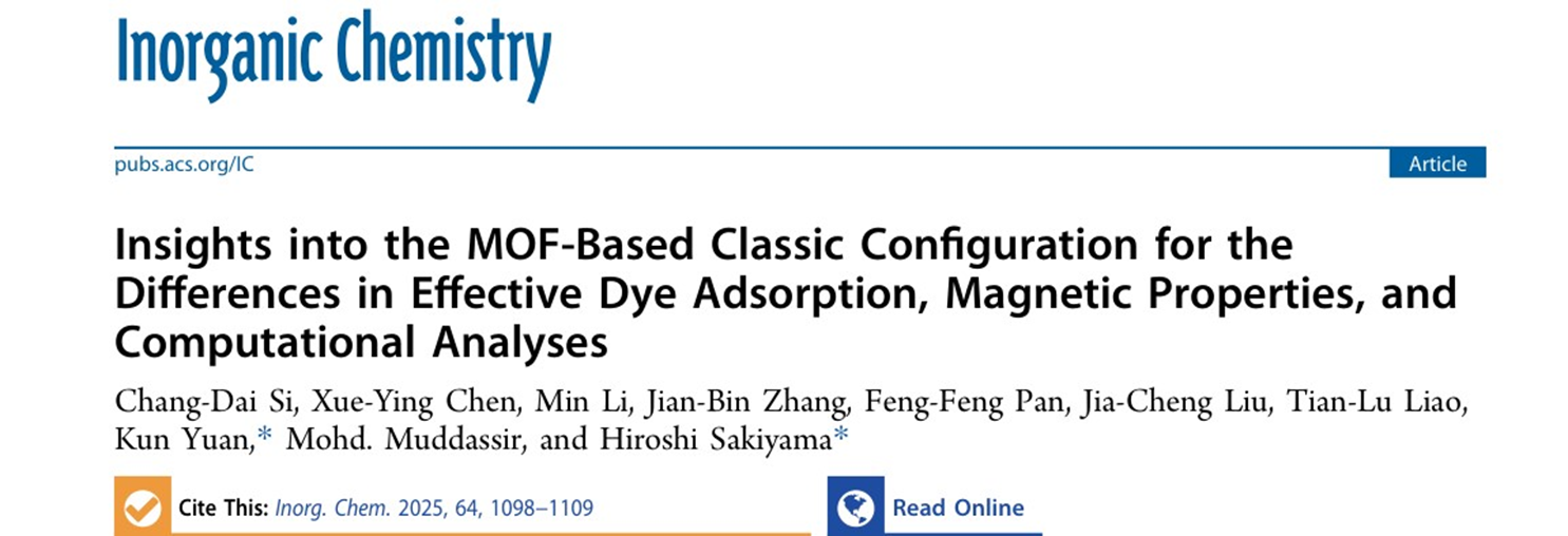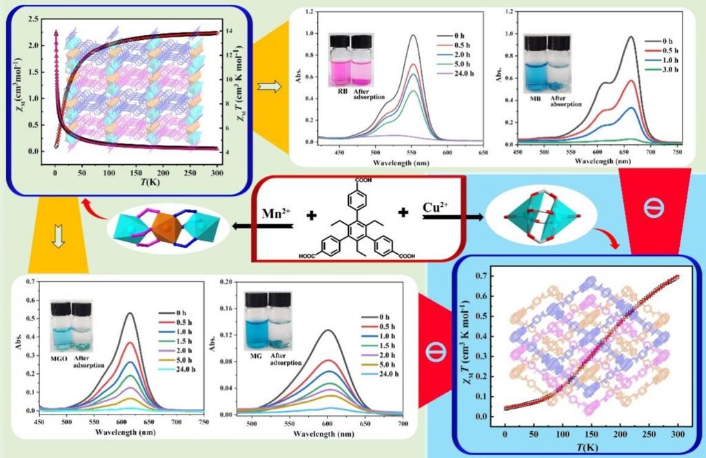 近日,bat365正版唯一官网教师司长代教授在自然指数期刊《Inorganic Chemistry》发表题为“Insights into the MOF-Based Classic Configuration for the Differences in Effective Dye Adsorption, Magnetic Properties, and Computational Analyses”研究论文(doi.org/10.1021/acs.inorgchem.4c04705),bat3652023级物理化学专业硕士研究生陈雪莹为第二作者,袁琨教授和日本山形大学的Hiroshi Sakiyama教授为通讯作者。金属有机框架(MOF)具有多种与结构相关的特性,如染料吸附和降解、磁性、气体吸附与分离以及多相催化等,近年来受到了广泛的关注。本论文主要对溶剂热合成的MOFs进行了紫外-可见光谱分析、ζ电位测定、有效孔径测定、透射电子显微镜(TEM)和扫描电子显微镜(SEM)表征以及密度泛函理论计算等,用以研究Cu-MOF和Mn-MOF的准确吸附位点以及染料吸附差异和磁性。结果表明Mn-MOF对阳离子染料(罗丹明B、甲基蓝、孔雀绿和甲基绿)表现出显著的吸附性能,去除率分别达到95.2%、95.0%、87.0%和78.0%,而对于阴离子染料(甲酚红和甲基橙)几乎没有检测到吸附。然而,对于Cu-MOF,未能有效吸附选定的任何染料。此外,实验和理论计算详细研究了MOFs磁性,揭示了Cu(II)和Mn(II)中心之间的反铁磁相互作用及磁交换机理。这项工作也为多功能MOFs合成和性质研究提供思路和理论基础。