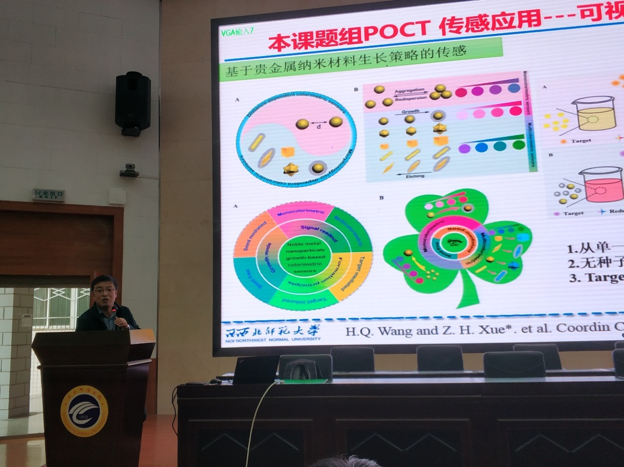 赵军锋教授作了题为“炔酰胺类缩合剂的发现及其应用”的报告,重点阐述了炔酰胺类缩合剂的发现过程、作用机理及其在多肽与蛋白质化学合成、环肽合成、硫肽合成、酯化及大环内酯化等反应中的研究进展。薛中华教授作了题为“基于纳米酶活性调控的光热传感策略”的报告,报告就纳米酶的发现、纳米酶新概念、纳米酶独特的催化特性及其传感应用进行介绍,重点讲述了基于纳米酶活性调控机制下的光热即时检测研究进展。