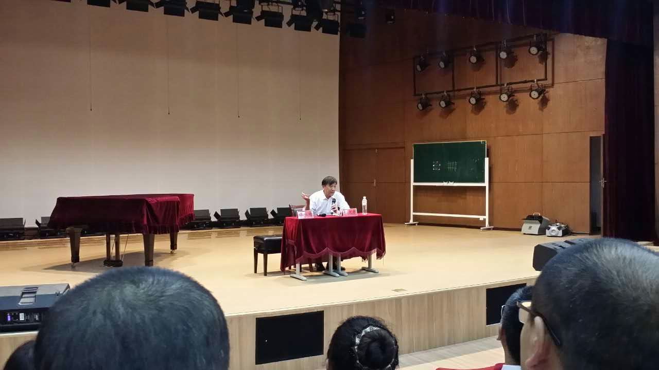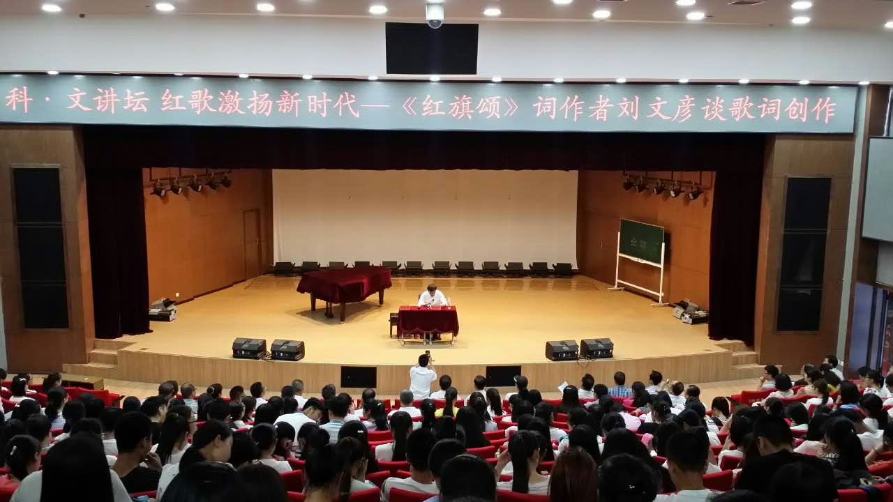 2016年6月27日晚,革命史诗大合唱《红旗颂》词作者刘文彦先生亲临天水师范学院,在音乐厅为bat365教职工及学生做了题目为《红歌激扬新时代——革命史诗大合唱<红旗颂>创作背景》的报告。