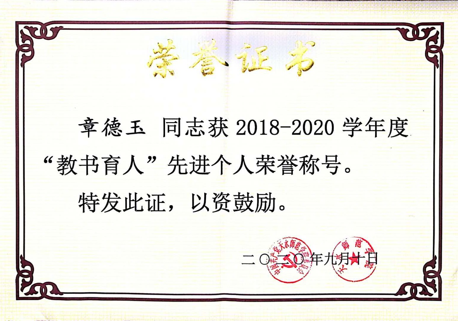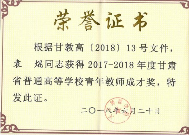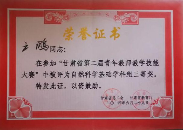 近年来,学院在新进青年教师中实施“青年教师培养导师制”,使青年教师尽快熟悉教学过程,成长为教学能手。鼓励年轻教师攻读博士学位,十三五期间,共引进博士13人,4位教师获评正高级职称,2位教师获评副高职称,3位教师攻读博士学位。1人入选教育部“新世纪人才”,2人被聘为甘肃省“青年飞天学者”,1人入选甘肃省领军人才,1人荣获甘肃省园丁奖,5人荣获甘肃省高等学校青年教师成才奖,9人入选bat365“青蓝人才工程”。1位教师获天水师院“四有”好老师,11位教师荣获天水师院“三育人”先进个人,2位教师获天水师范学院第三届教学优秀奖。在校级“微课竞赛”中,1位教师荣获一等奖,1位老师荣获二等奖。