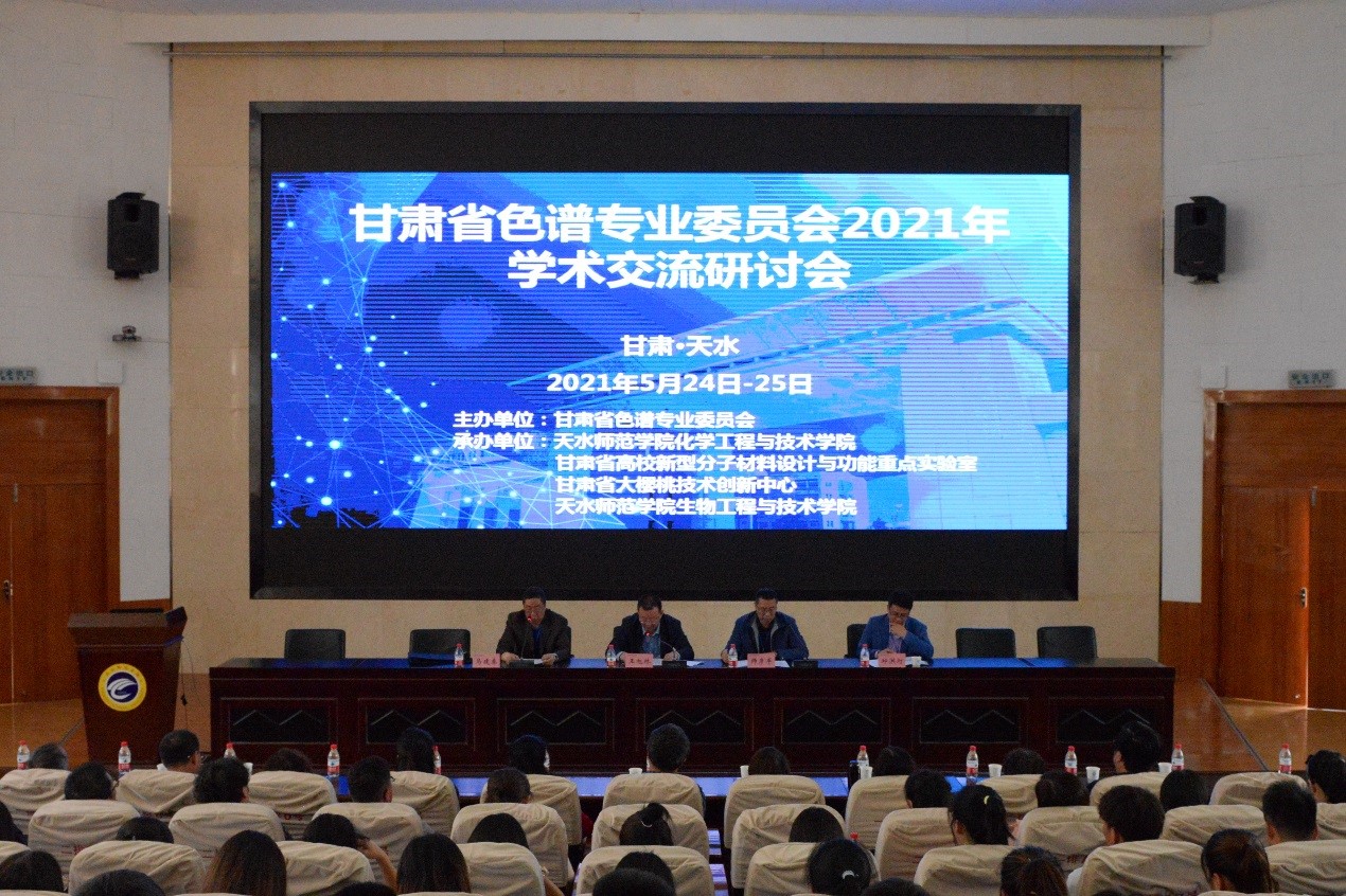 5月24日至25日,由甘肃省色谱专业委员会主办、天水师范学院bat365正版唯一官网、甘肃省高校新型分子材料设计与功能重点实验室、甘肃省大樱桃技术创新中心与生物工程与技术学院共同承办的甘肃省色谱专业委员会2021年学术交流研讨会在bat365举行,来自中科院兰州化物所、兰州大学、兰州理工大学、西北民族大学、甘肃医学科学研究院、中国石油石油化工研究院兰州化工研究中心、甘肃出入境检验检疫局技术中心、甘肃省人民医院、浙江福立分析仪器股份有限公司和bat365等10所高校、科研单位及企业的近40位专家学者参加会议。