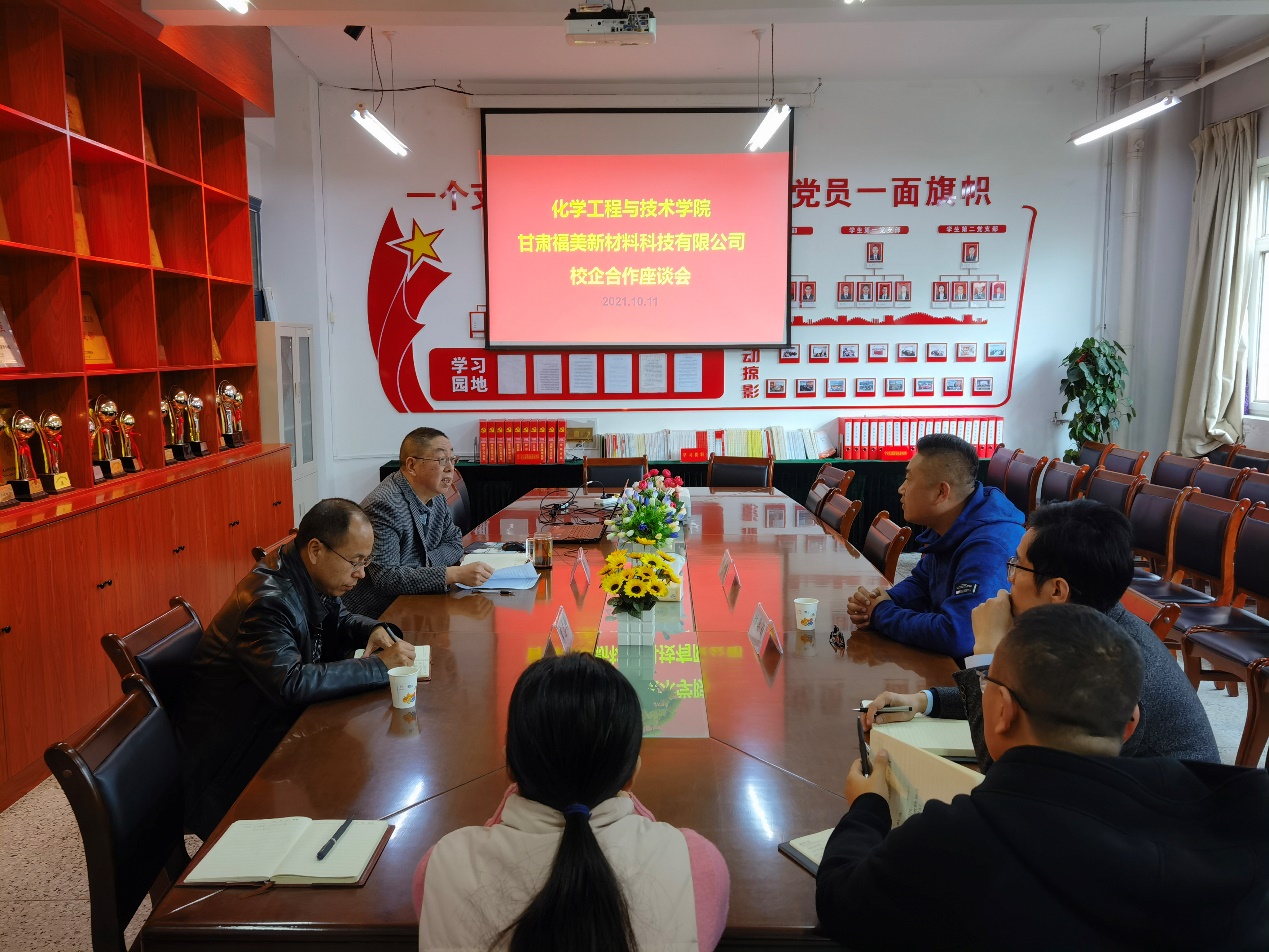为深化校企合作,促进产学研结合,10月11日上午,bat365正版唯一官网与甘肃福美新材料科技有限公司校企合作座谈会在3号实验楼211会议室举行。甘肃福美新材料科技有限公司侯国林主任,bat365正版唯一官网院长马建泰教授及部分教师代表参加本次座谈会。