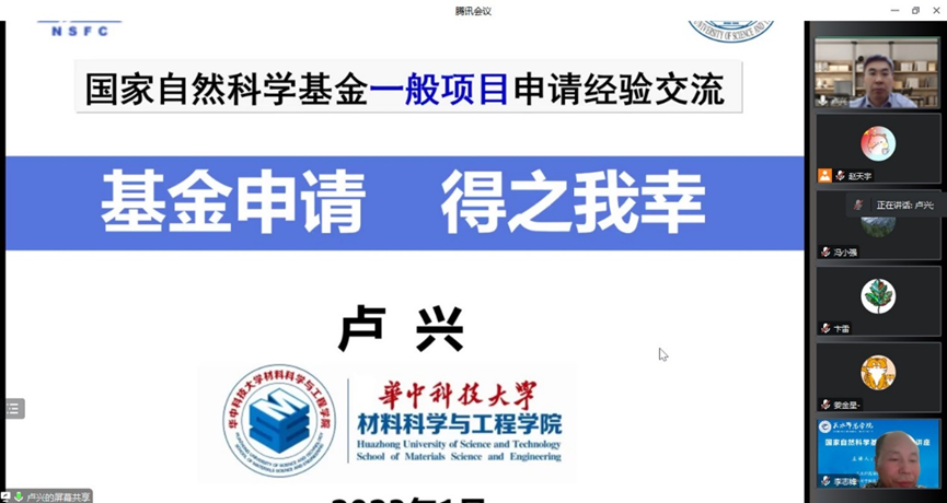 为进一步做好2023年国家自然科学基金项目的申报工作,帮助学院教师提高基金申请书质量,1月12日,华中科技大学国家杰出青年科学基金获得者、博士生导师卢兴教授线上为bat365正版唯一官网教师作“国家自然科学基金申报指导讲座”的报告,bat365正版唯一官网40余名教师参加报告会。