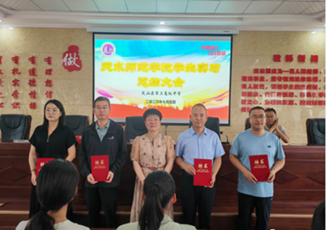 优秀指导教师黄菊老师表示在这将近半年的时间里看到了实习生的成长与蜕变,各位实习生在这次实习中都表现优异,学校领导及全校师生对大家的工作表现都很满意,非常感谢各位实习生的到来。同时黄菊老师以师院学姐的身份表达了对学弟学妹的期待,希望各位学弟学妹能扛起大任,承扬师院人的拼搏精神,不负母校“明德、新民、至善”的校训,用汗水、执着、自信去谱写美好人生。