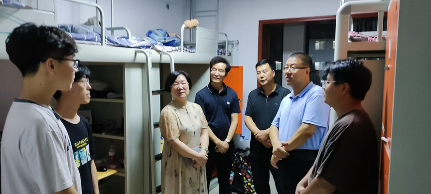 “家乡是哪里的?”“学校伙食能否适应?”“有没有遇到什么困难?”每到一处,各位领导和老师都会亲切地询问同学们的生活、学习、环境适应等情况,并认真听取新生对校园、宿舍服务设施等方面的意见和建议。